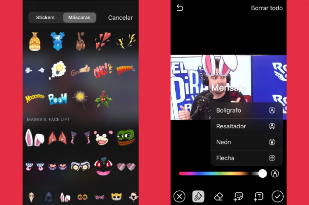 En los vídeos también puedes dibujar. Tendrás a tu disposición diferentes texturas, como bolígrafo, resaltador, flecha o neón, así como colores variados. Y si lo prefieres, también admite texto mecanografiado.