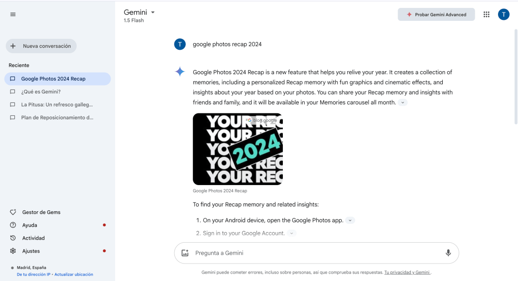 Google puntualiza en sus artículos relacionados con el Recap 2024 que esta «función experimental» con Gemini puede presentar incoherencias y no siempre representa fielmente lo que muestra la fotografía. Por esta razón, invita a los usuarios a enviar sus comentarios para mejorar esta función.