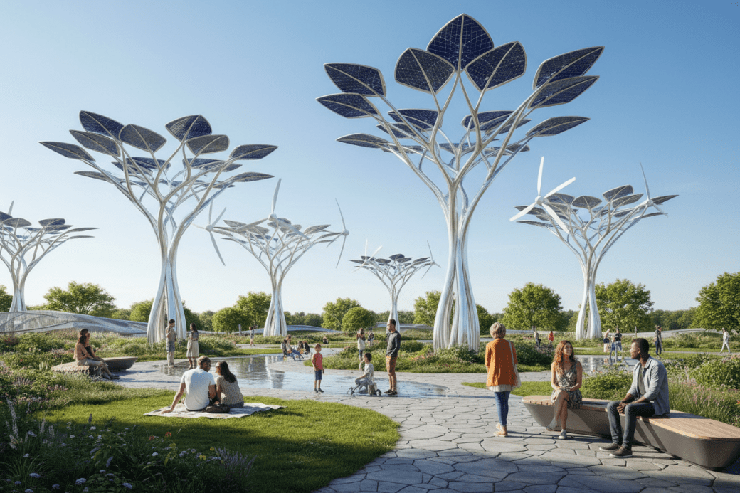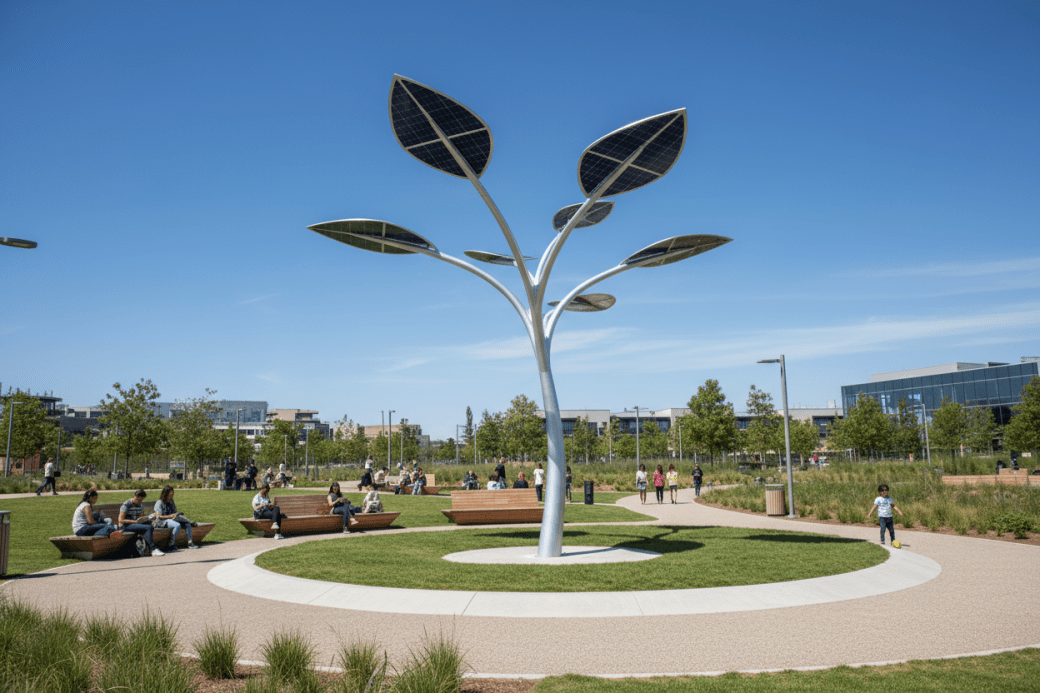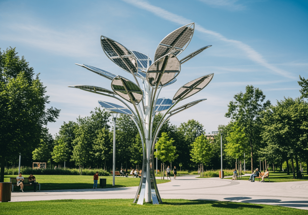 Pero la revolución de los árboles solares no se queda en el bosque; su verdadero campo de batalla es la ciudad. Generalmente, se integran en parques, plazas y campus como si fueran mobiliario urbano inteligente. Su instalación de paneles solares es mucho menos invasiva que la de las grandes plantas termosolares. El árbol solar fotovoltaico no solo genera energía solar, sino que se convierte en un hub tecnológico que ofrece carga para dispositivos y Wi-Fi a la comunidad (Mi Panel Solar, 2025).