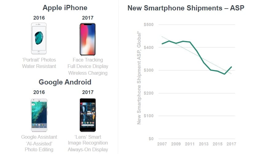 Aunque fue el primer año en que los envíos de unidades de teléfonos inteligentes no creció, la presencia de los smarthphones en la sociedad es tremenda. Las compañías tecnológicas cada vez fabrican mejores dispositivos, más baratos y más rápidos. Los precios siguen bajando, y esto sirve para se impulse su compra en mercados menos desarrollados.